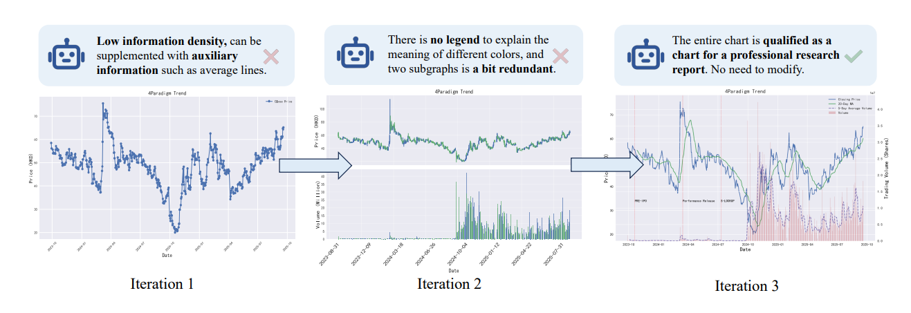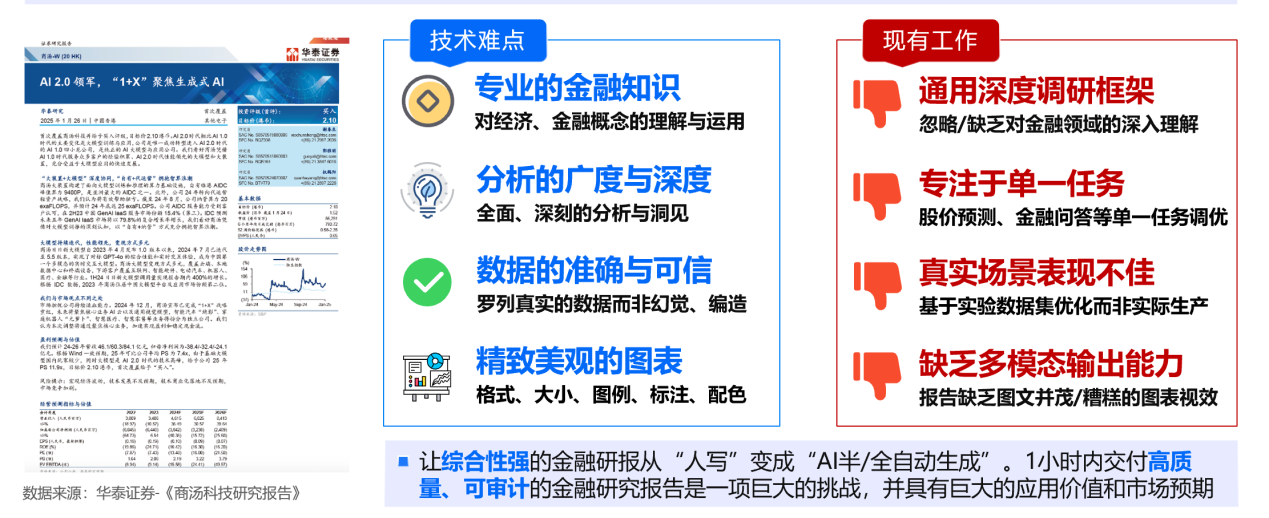 3. 阐发深度不脚:大大都系统采用固定的“检索-生成”单向流程,1. 范畴学问匮乏取数据割裂:通用搜刮系统无法无效整合及时的布局化金融数据(如万得、彭博终端数据)取非布局化旧事,撰写一份专业研报是极高强度的智力劳动,均被视为变量存储。狂言语模子(LLM)做为“步履者”担任编写画图代码,更依赖严谨的逻辑阐发取专业的可视化呈现。数以亿计的投资决策依赖于高质量、及时的研报。从数据精确性、标签清晰度及全体美妙度等多个维度提出点窜。
