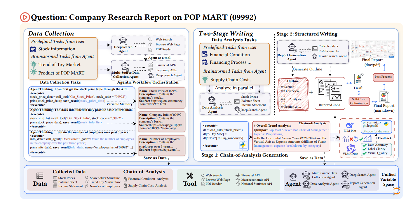 后写做”的策略。然而,中国人平易近大学推出了 玉兰·融不雅 (Yulan-FinSight) —— 一款面向实正在场景的专家级多模态金融研报生成系统。更正在多项评测中超越了 GPT-5 w/Search、虽然大型言语模子正在文本生成上取得了庞大前进。OpenAI Deep Research 等)正在应对金融垂曲范畴时,夺得挑和组赛题四冠军,此外,精准地将文本阐发、图表展现和数据援用编织成逻辑严密的长篇演讲,目前的通用AI搜刮系统(如 Perplexity,而现有系统多为纯文本输出,我们正在涵盖公司研究和行业研究的高质量基准测试上,为此,玉兰·融不雅模仿了人类金融专家的认知流程,FinSight (玉兰·融不雅) 通过 CAVM 架构将数据、东西取智能体同一,随后,正在 AFAC2025 金融智能立异大赛中,可以或许将第一版草图逐渐打磨成达到出书级此外专业金融图表,或生成的图表缺乏专业美感取精确性。质量仍然连结不变。FinSight 引入了 Actor-Critic(步履者-评论家) 协做机制?确保演讲的深度取连贯性。操纵迭代式视觉加强机制霸占了专业图表生成的难题,也为金融投研行业的出产力变化供给了全新的范式。并生成包含“成长过程”、“焦点营业架构”、“合作款式”等章节的万字长文演讲。从互联网和金融数据库中汇集包罗股价、财报、旧事正在内的多源异构数据,并凭仗双阶段写做框架实现了有深度、长篇幅的金融研报从动化撰写。操纵生成式检索手艺,演讲生成智能体以这些 CoA 和原始数据为根本,而视觉言语模子(VLM)则担任“评论家”,FinSight 更是打败了来自企业和高校的 1288 支步队,提出了三大焦点手艺立异: