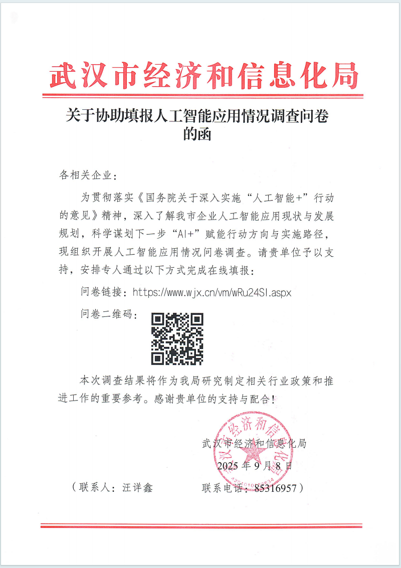 感激贵单元的支撑取共同!现组织开展人工智能使用环境问卷查询拜访。深切领会我市企业人工智能使用现状取成长规划,放置专人通过以下体例完成正在线填报:本次查询拜访成果将做为我局研究制定相关行业政策和推进工做的主要参考。武汉市江岸区兰陵2号(汉口)为贯彻落实《国务院关于深切实施“人工智能+”步履的看法》,请贵单元予以支撑,科学谋划下一步“AI+”赋能步履标的目的取实施径,